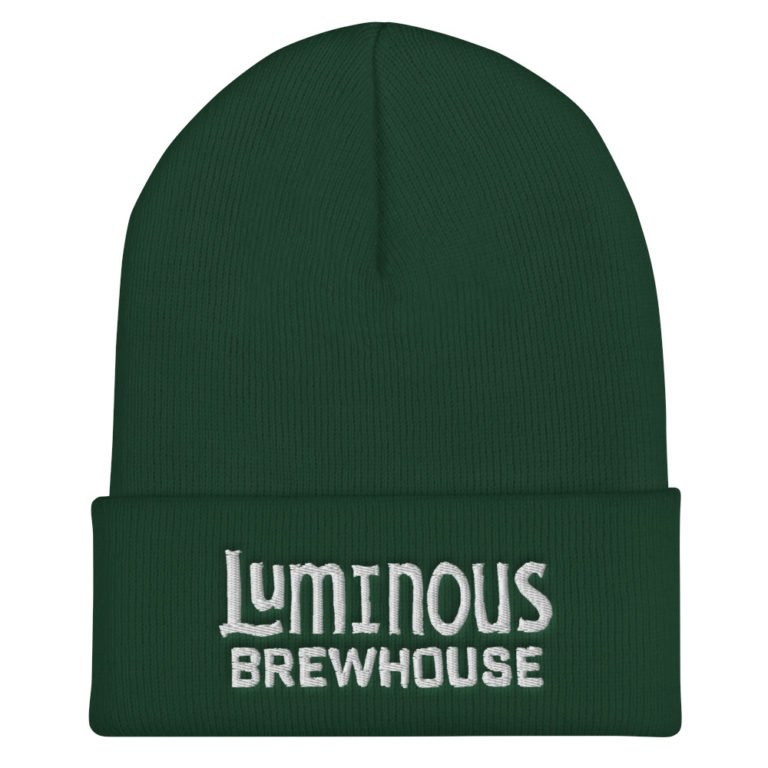 The Luminous Brewhouse cuffed beanie knit winter cap keeps your head warm while you sip your cold beer.