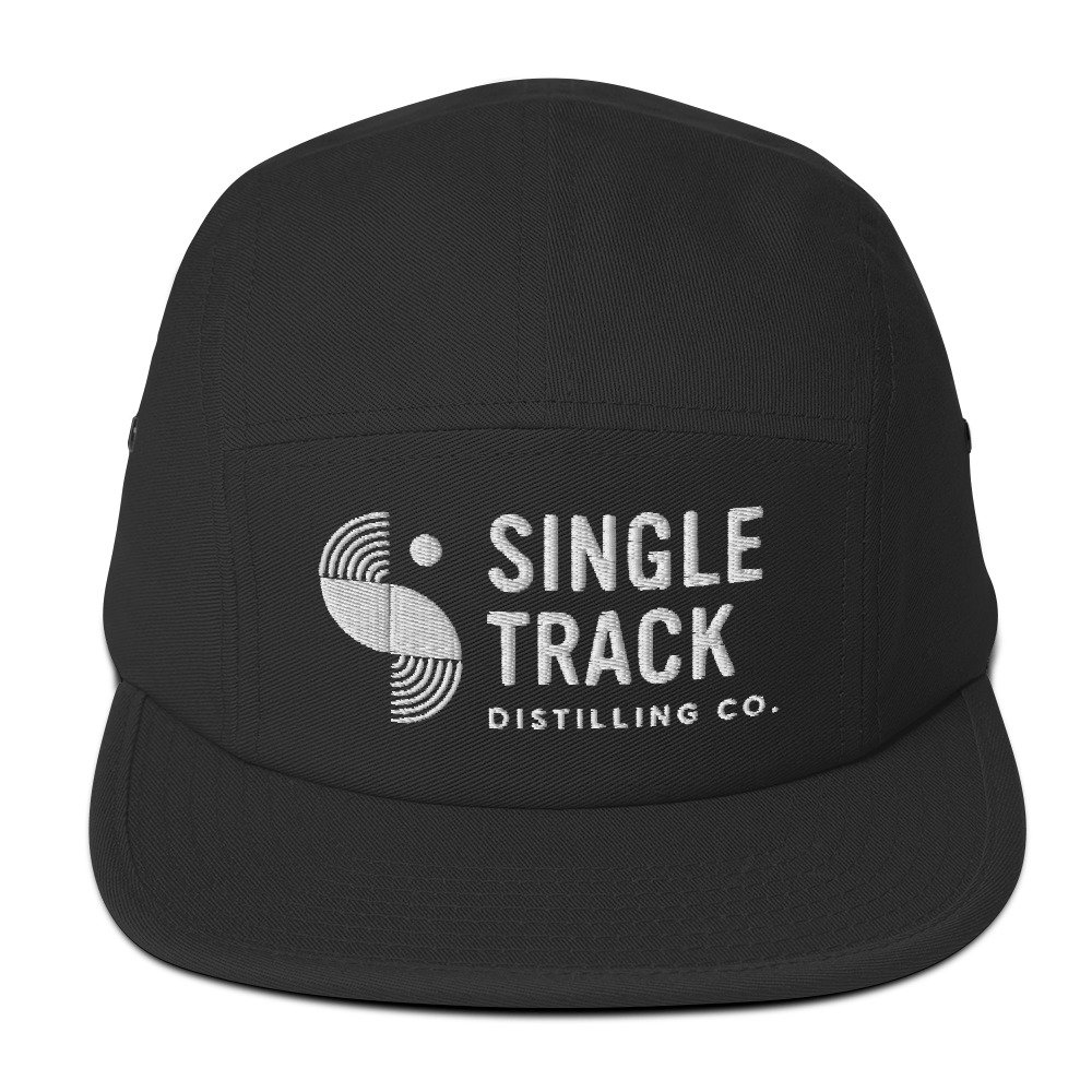 The Single Track Distilling Co. logo embroidered on a 5 panel camper style cap has a low profile and nylon strap clip closure.